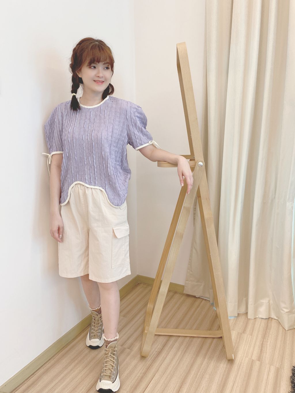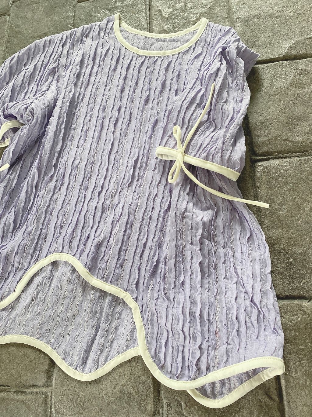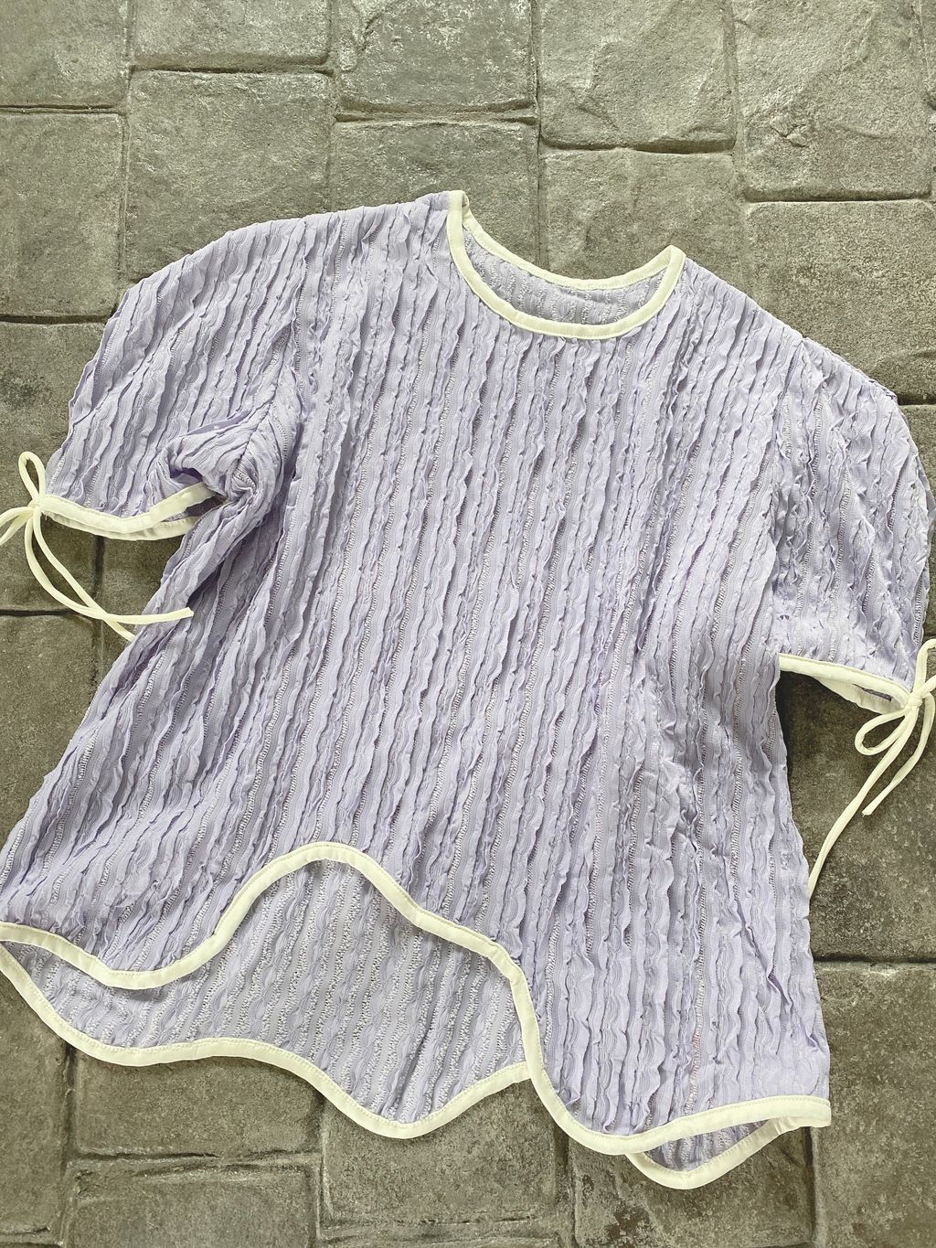 舒适亲肤弹性布料,短袖立体暗花波浪设计,圆领口显瘦,袖口有蝴蝶结,衣摆不规则设计。
